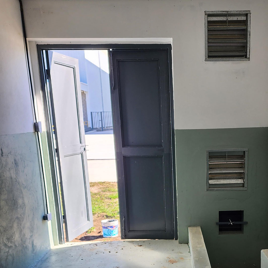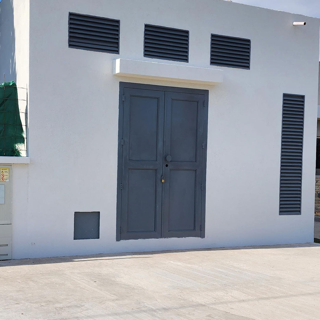 - Según lo indique el proyecto, en algunos casos la empresa de energía solicita la instalación de persianas cortafuego detrás de la ventilación de la puerta (ver imagen).